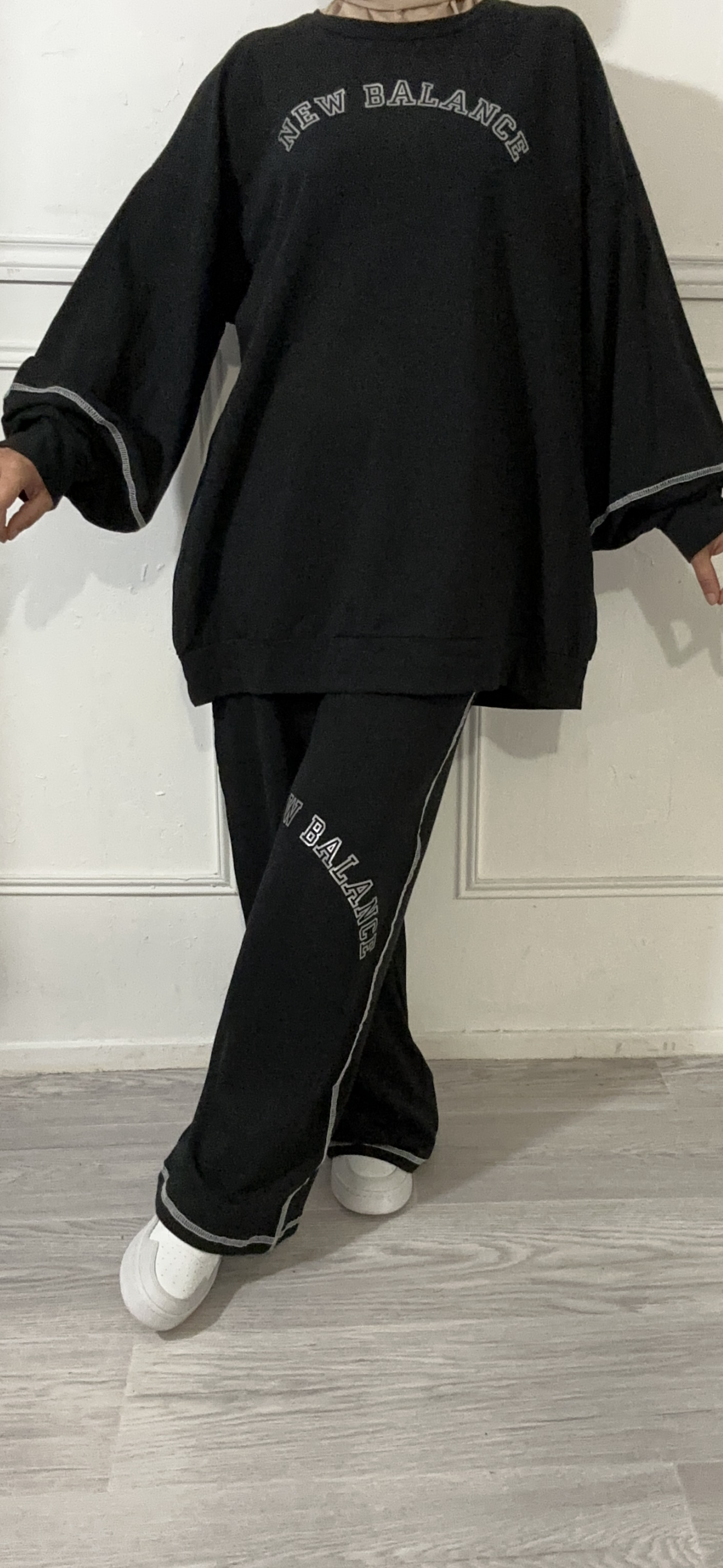 c’est ensemble est 100 % coton, composé d’un pull over size manches bouffante détails sur les manches couture à revers ainsi qu’un pantalon taille haute coupe droite, légèrement évasée. C’est ensemble convient d’un 36 à un 42 sans problème. Attention au risque de mouler sur les hanches dans tous les cas le pull Couvre bienle bas du dos.