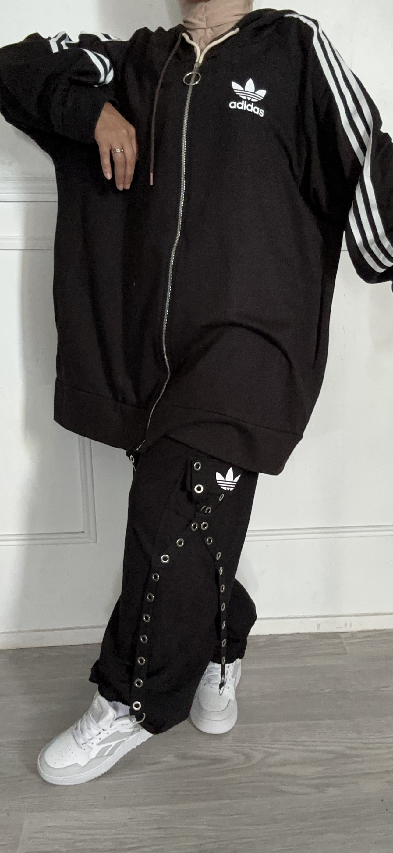 ensemble sportswear, cosy, composé d’un jogging large taille réglable flocage permanent ainsi qu’un gros gilet avec capuche. C’est ensemble est un taille unique chez les grande taille. Il convient parfaitement à partir de 38 40 jusqu’au 50. Attention suivant la morphologie, il peut +- être large ou serré mais vous serez très confortable dedans.