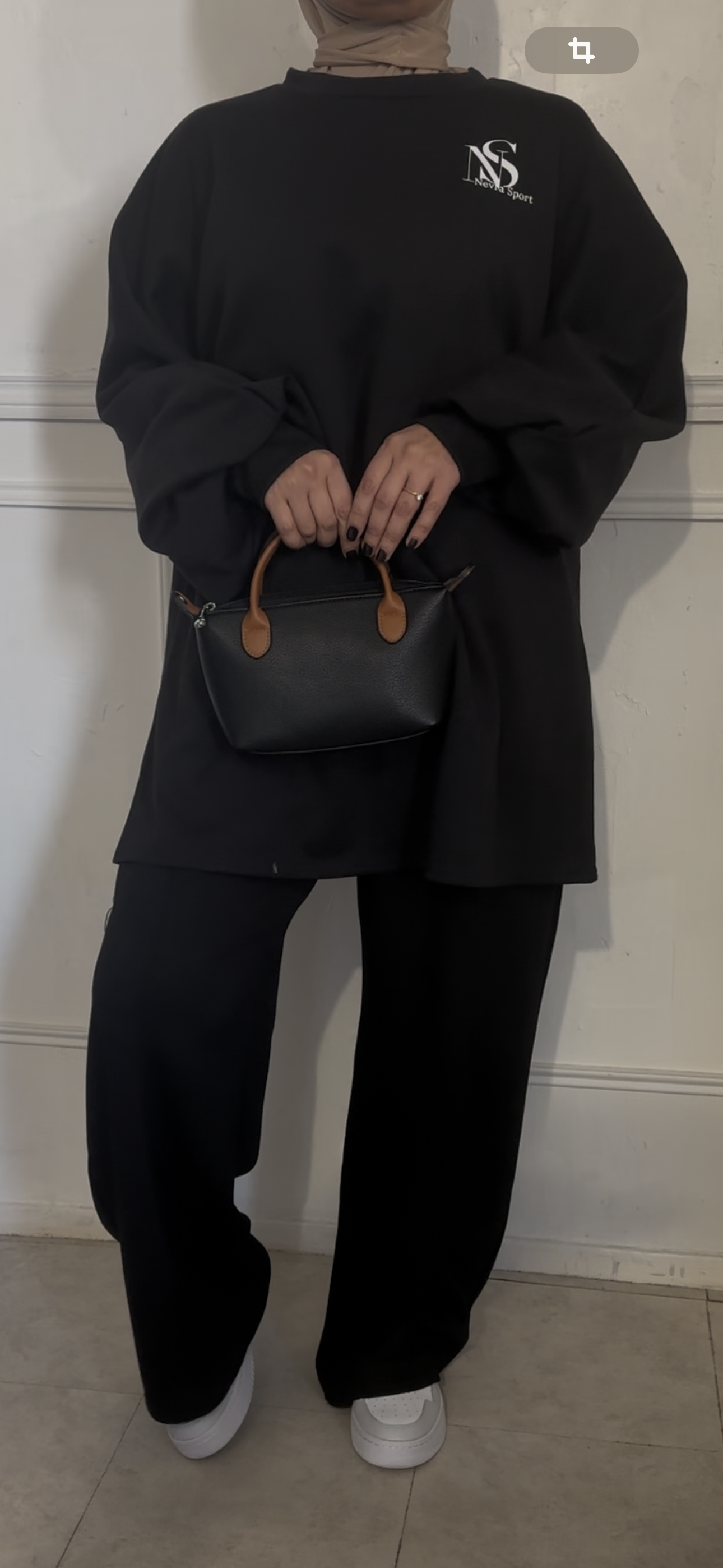 L’ensemble est composé de deux pièces, un pull over size manches bouffante, tissu, fluide et complètement opaque. Parfait pour la saison ainsi qu’un Palazzo taille haute double poche latérale, détail couture sur les jambes.